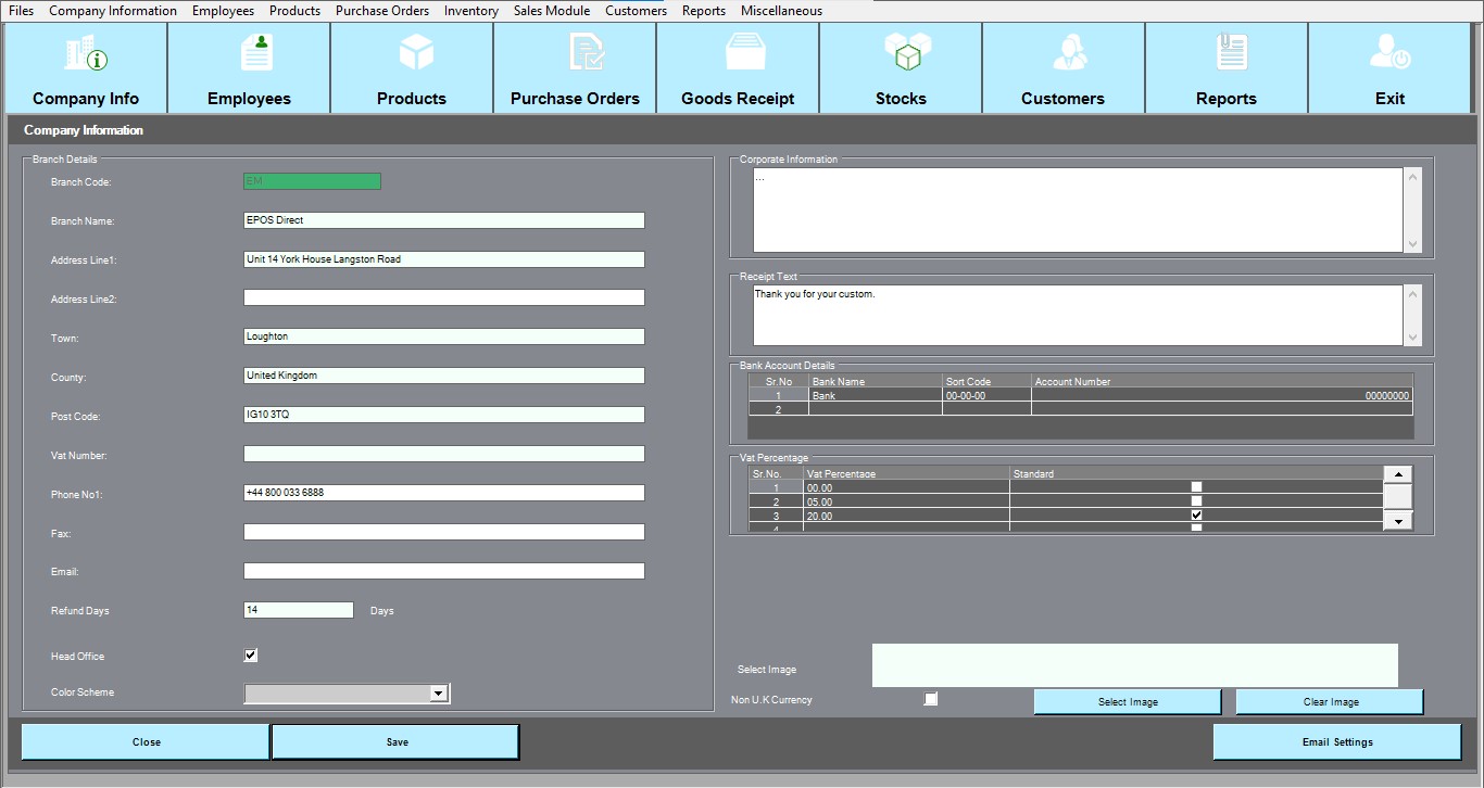 Here the business name and address details needs to be added then also VAT number if business is registered and finally the receipt text and Vat percentages need to be also added.