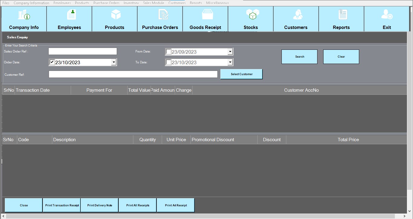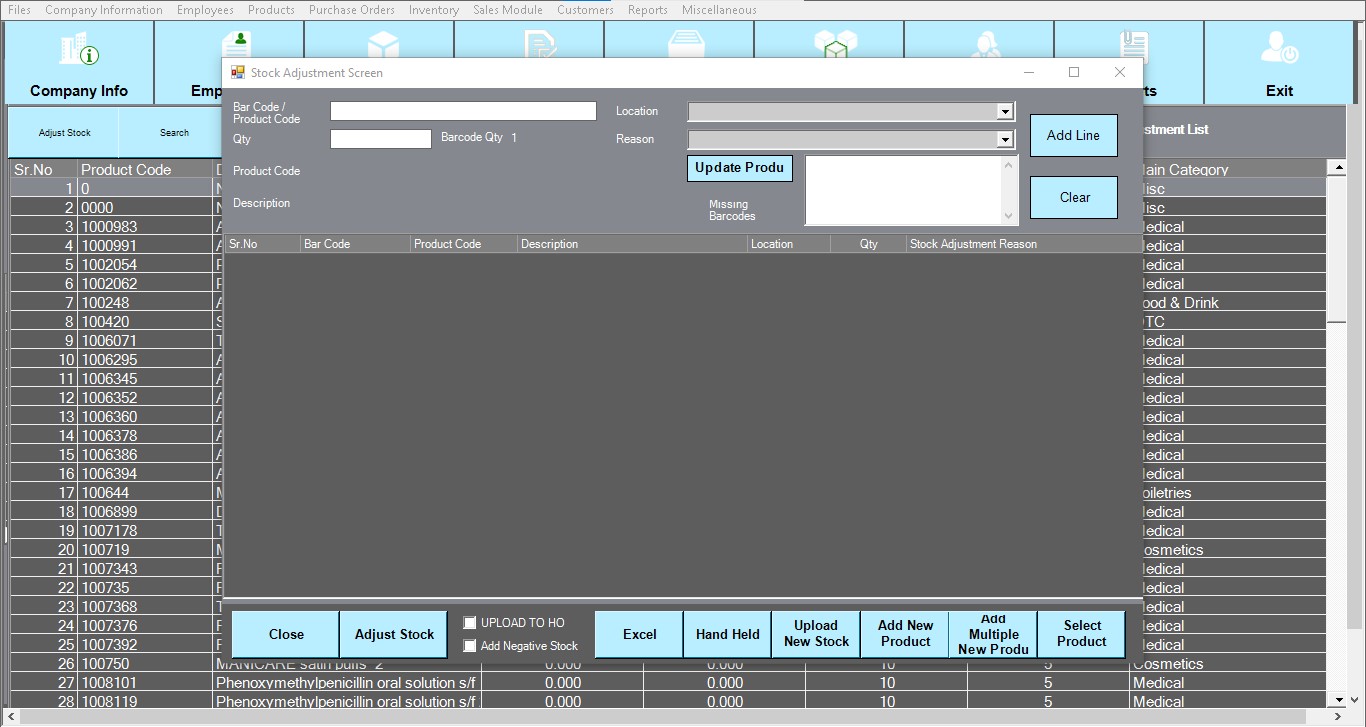 You can search the product by name, scanning the product barcode, product code, category, and sub-category and supplier name link to the product.