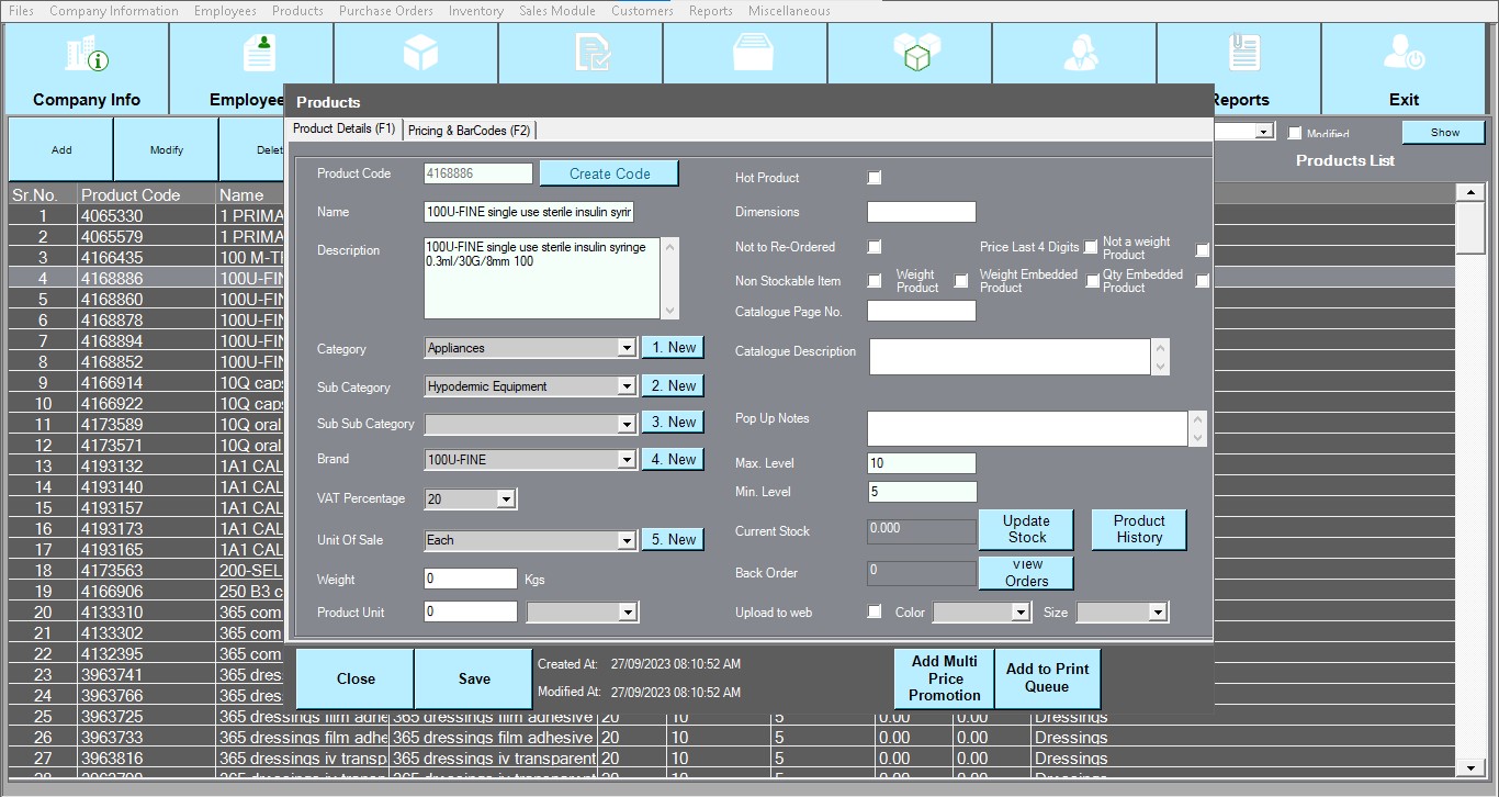 Product Details (F1)- Product Code; Add the product code or click on create code for the system to create a default code for the item. Notes: this section is not for the barcode, it is just to add the product code for the system to recognise and register the items.