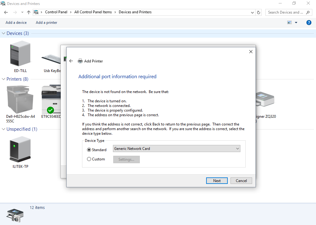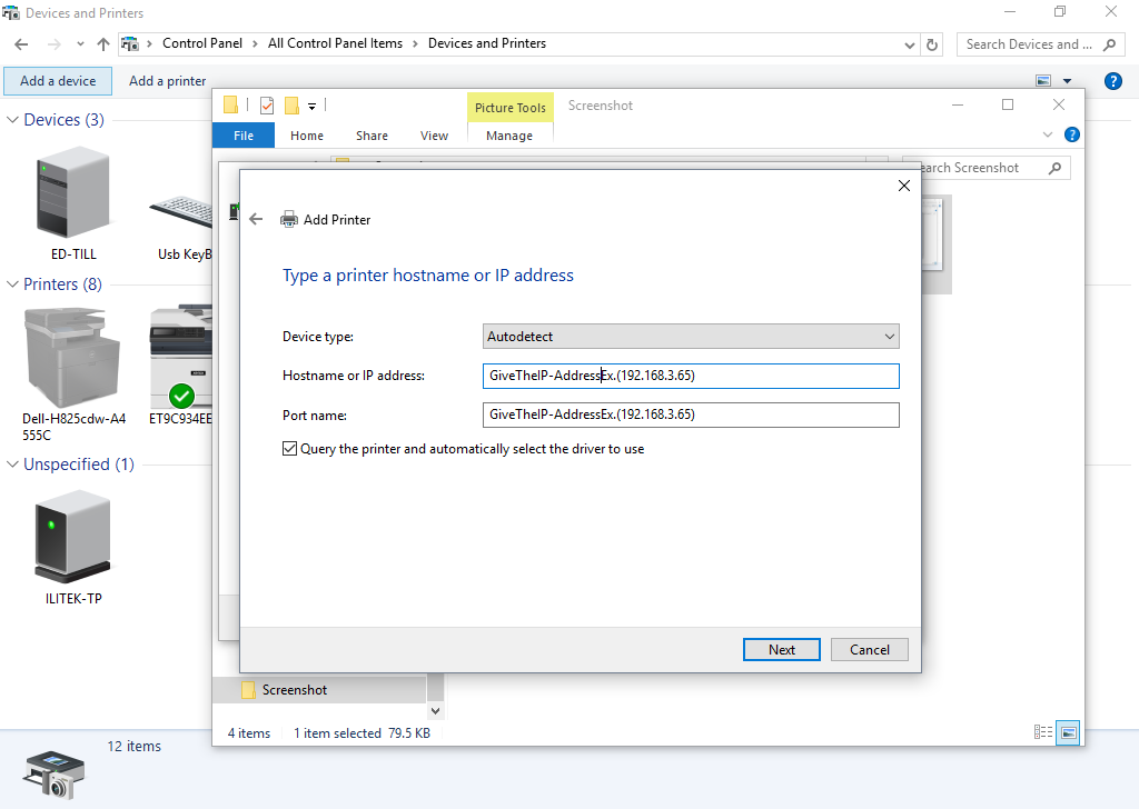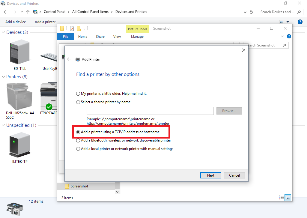 In the Hostname or IP address box enter the IP address of the printer which you found. Click Next