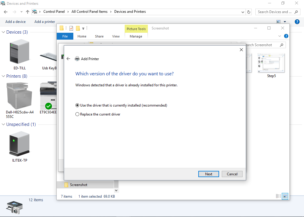 In screen below select the radio button (Use the driver that is currently installed and click Next