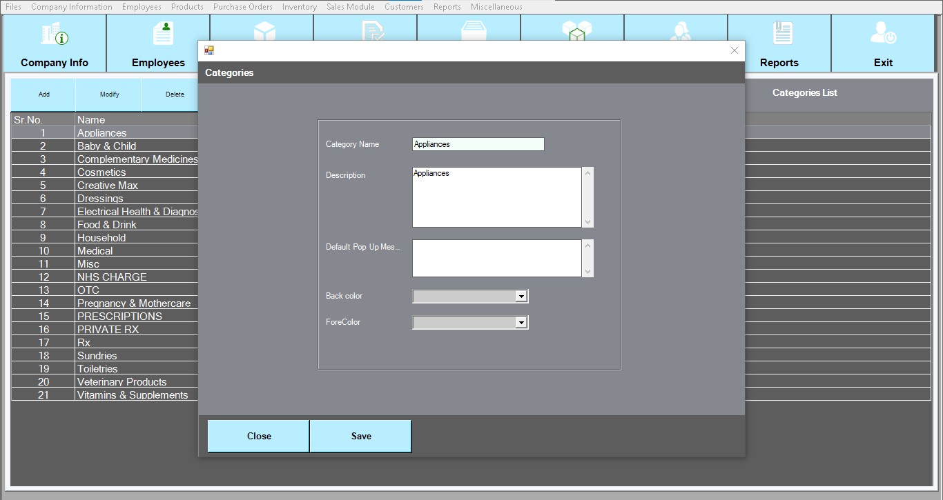 - Category; Click on the new button to create the product category. i.e. drinks, then add colour by selecting from the back colour list and also the fore colour of your choice. These colour will allow the product to show on the till display home page then click on Save.