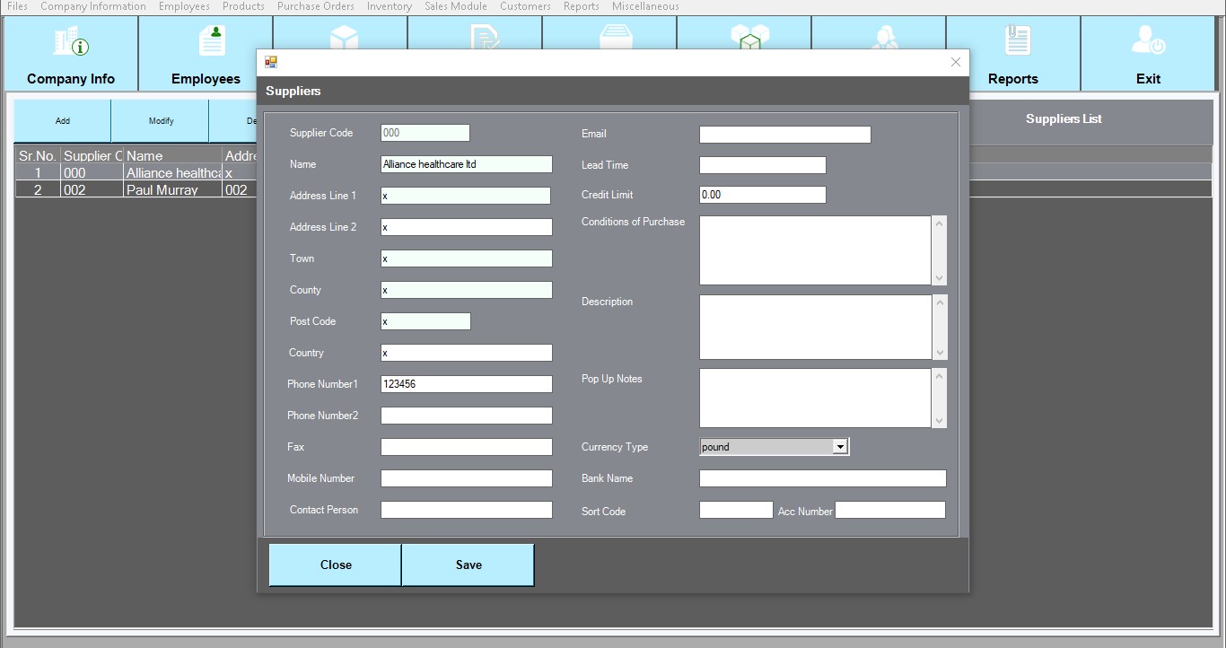 - New supplier; Here you can add the supplier that is linked to the product. Click on new supplier button then add the details. The product can be linked to supplier who supplies the product, the link can be done from the selected drop down.