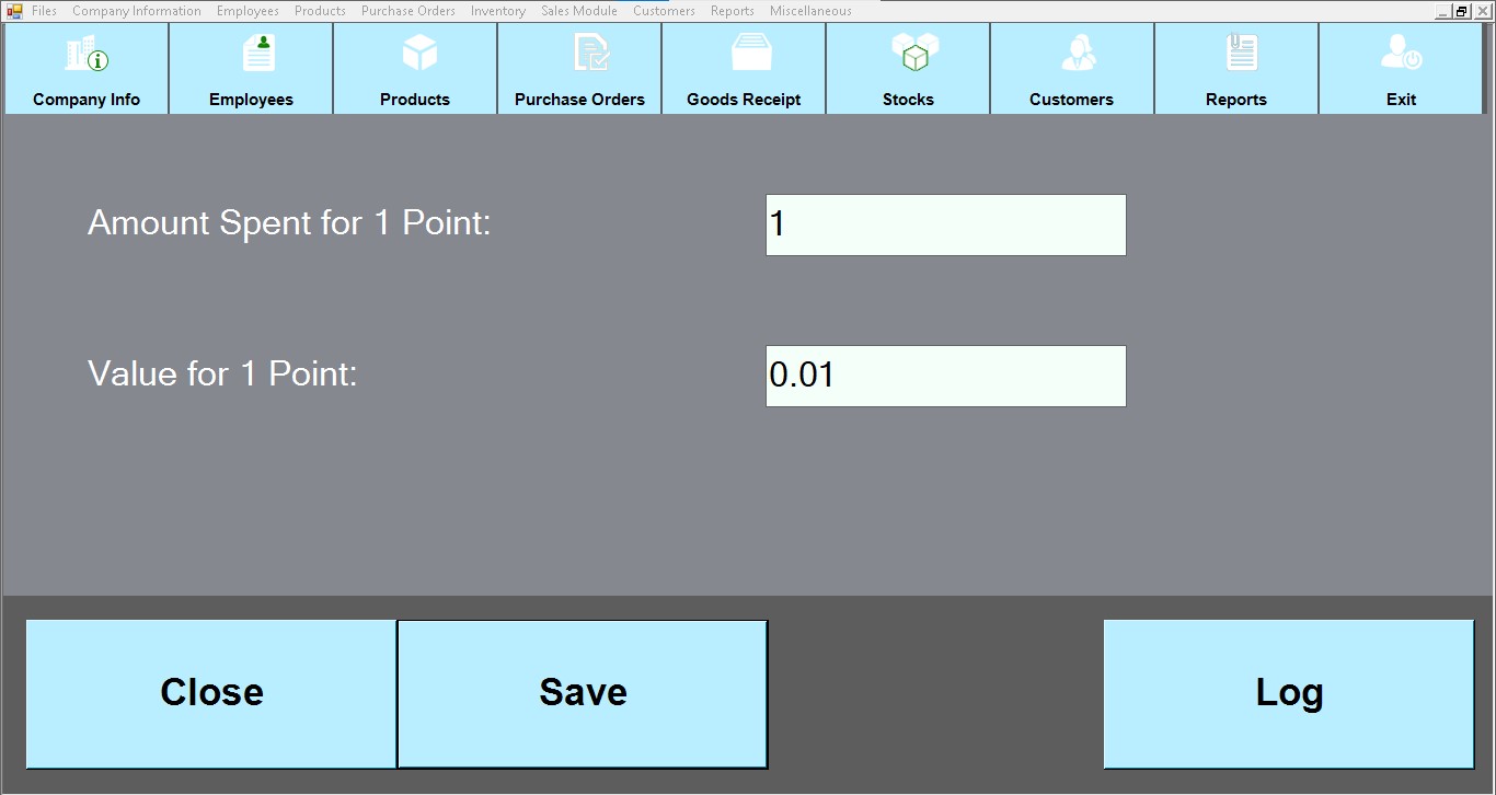 Here the customer loyalty settings can be set, you can set how much has to be spent for single point and how much value has to be declared for 1 point.