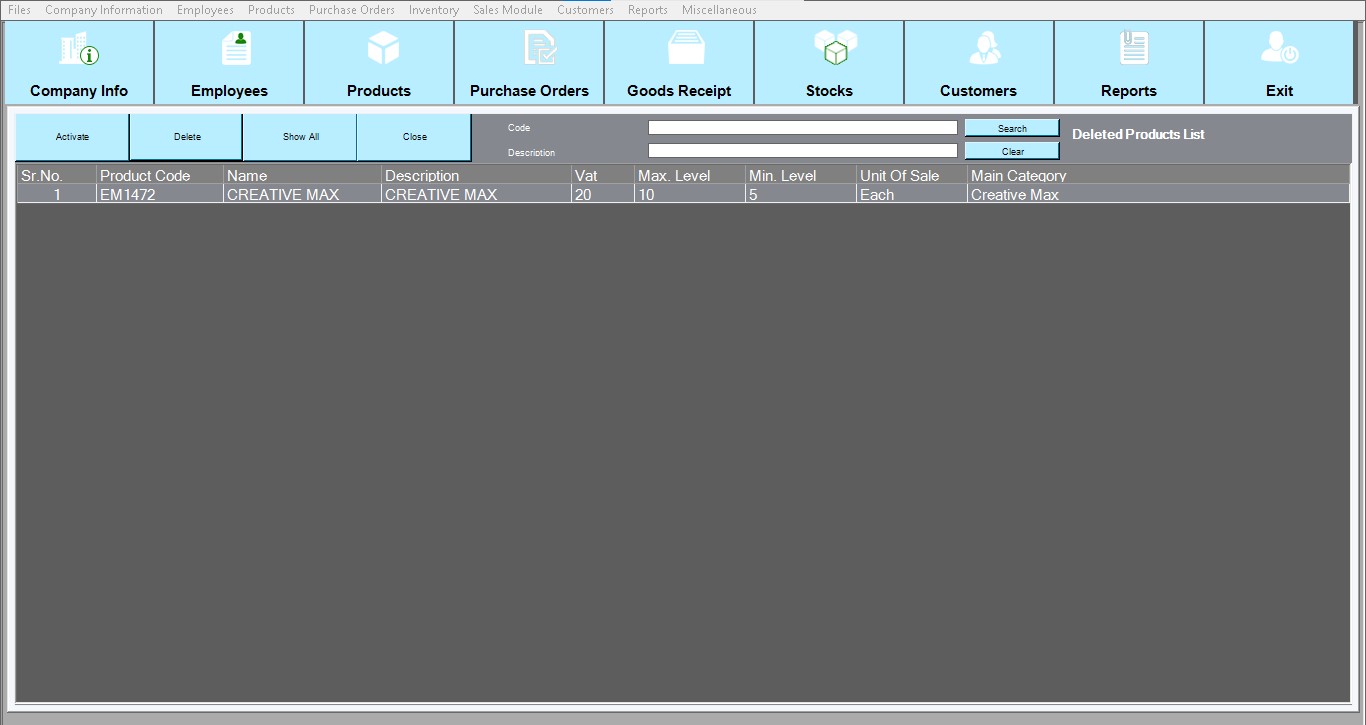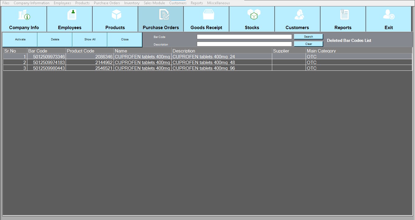 This acts as recycle bin, once the bar codes are deleted from the products, they fall in this list, and you can delete permanently or activate the barcode again.